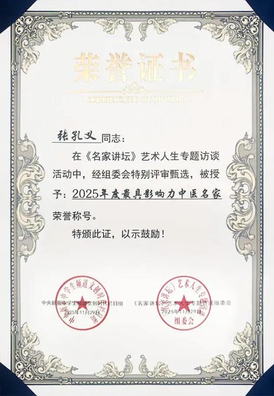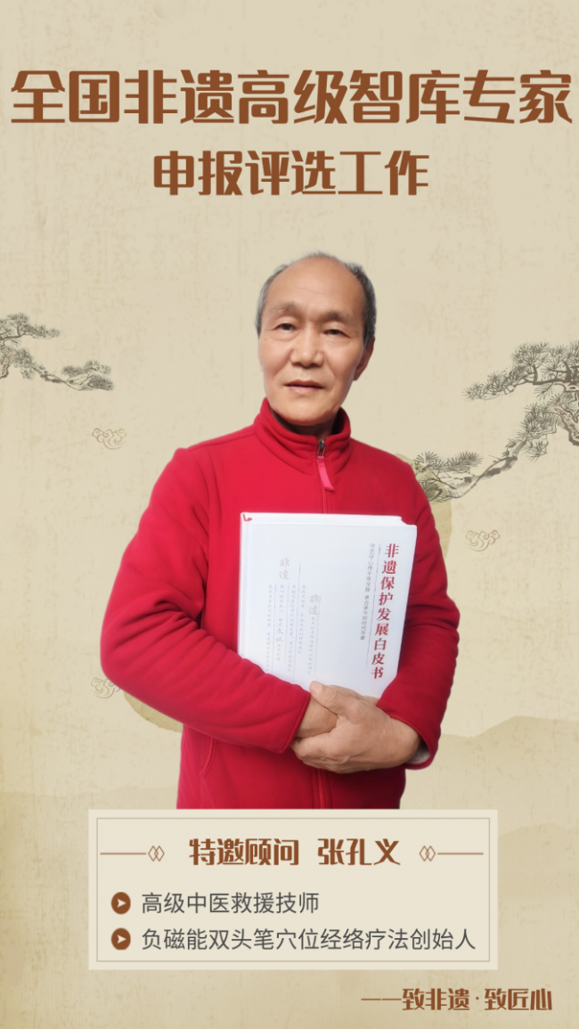 张孔义,湖北沙市人,中共党员,湖北省模范团干部,负磁能双头笔穴位经络疗法创始人,高级中医救援技师。作为北京医铭匠中医技术院大医名匠专家联盟委员会专家委员、当代中医名家专家委员,他亦身兼中央新影中学生频道文创时代栏目组特约教授,先后荣获“2025年度最具影响力中医名家”、“2025年度非遗领军人物”、“中医非遗绝技卓越奖”等荣誉,2025 年在名家讲坛专题访谈活动中,授予:“2025 年度最具影响力中医名家”荣誉称号,2026年在两会重点推选项目名录中被中央新影中学生频道文创时代栏目组授予:“2026年献礼两会中医影响力人物”荣誉称号。